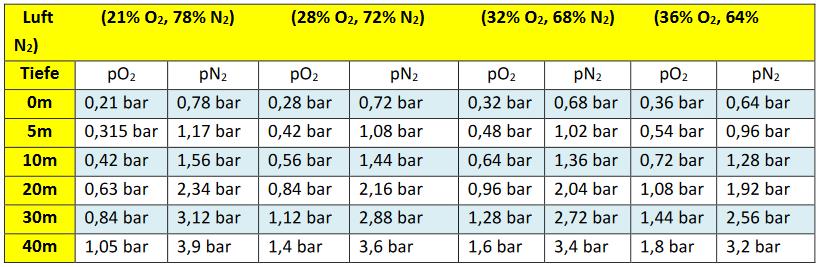 Beziehung von Tiefe und O2-/N2-Partialdruck in verschiedenen Gasgemischen bei einem Luftdruck von 1 bar