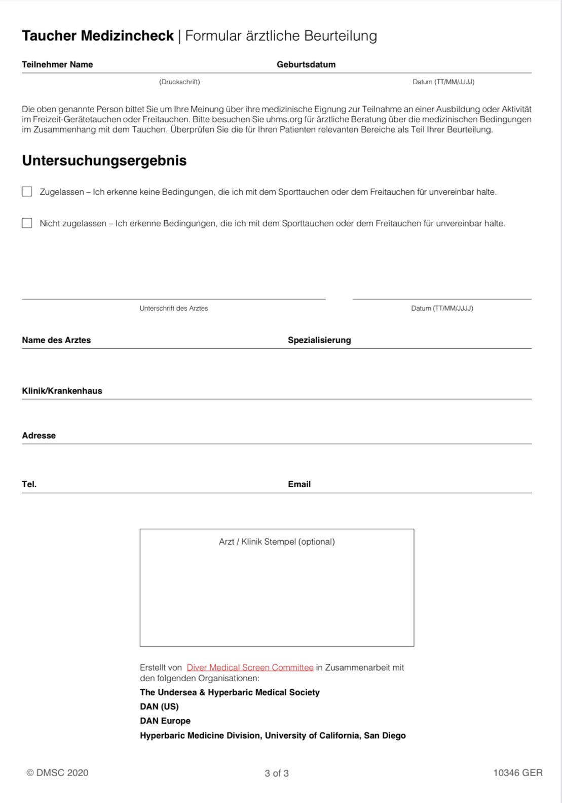 Eine Tauchtauglichkeitsuntersuchung ist eine tauchärztliche Untersuchung, mit dem Ziel, Tauchen gefahrenlos ausüben zu können. Die körperliche Gesundheit ist eine wichtige Voraussetzung für Sporttaucher.